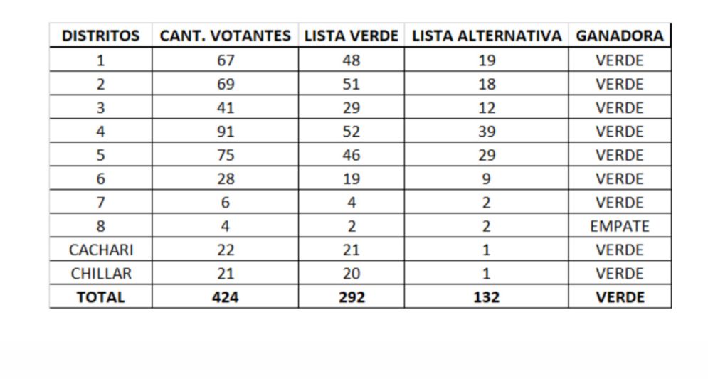 Los resultados por distrito fueron favorables a la lista oficial, la lista verde Compromiso y Participación, con un total de 292 votos a favor (69 %) y 132 para la lista alternativa (31 %).
